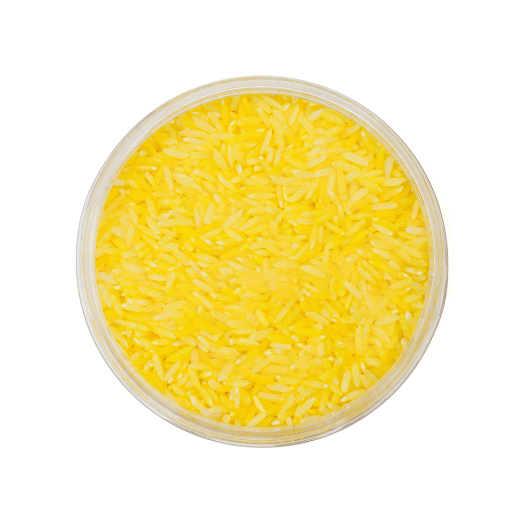 Onze gele speelrijst is gekleurd met voedselveilige kleurstof. Mocht er per ongeluk een korreltje in de mond terechtkomen, dan is dit niet schadelijk.