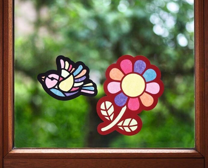 Maak creatieve raamafbeelding en bekijken hoe de zon de vrolijke kleuren laat stralen Geweldig retro knutsel speelgoed voor kinderen vanaf 4 jaar. De set bestaat uit 24 transparante gekleurde papieren vellen in 8 kleuren, 20 raam beelden, 18 sjablonen, 2 pijpenragers Afmeting 20 x 28 x 1 cm. Originele knutselset.